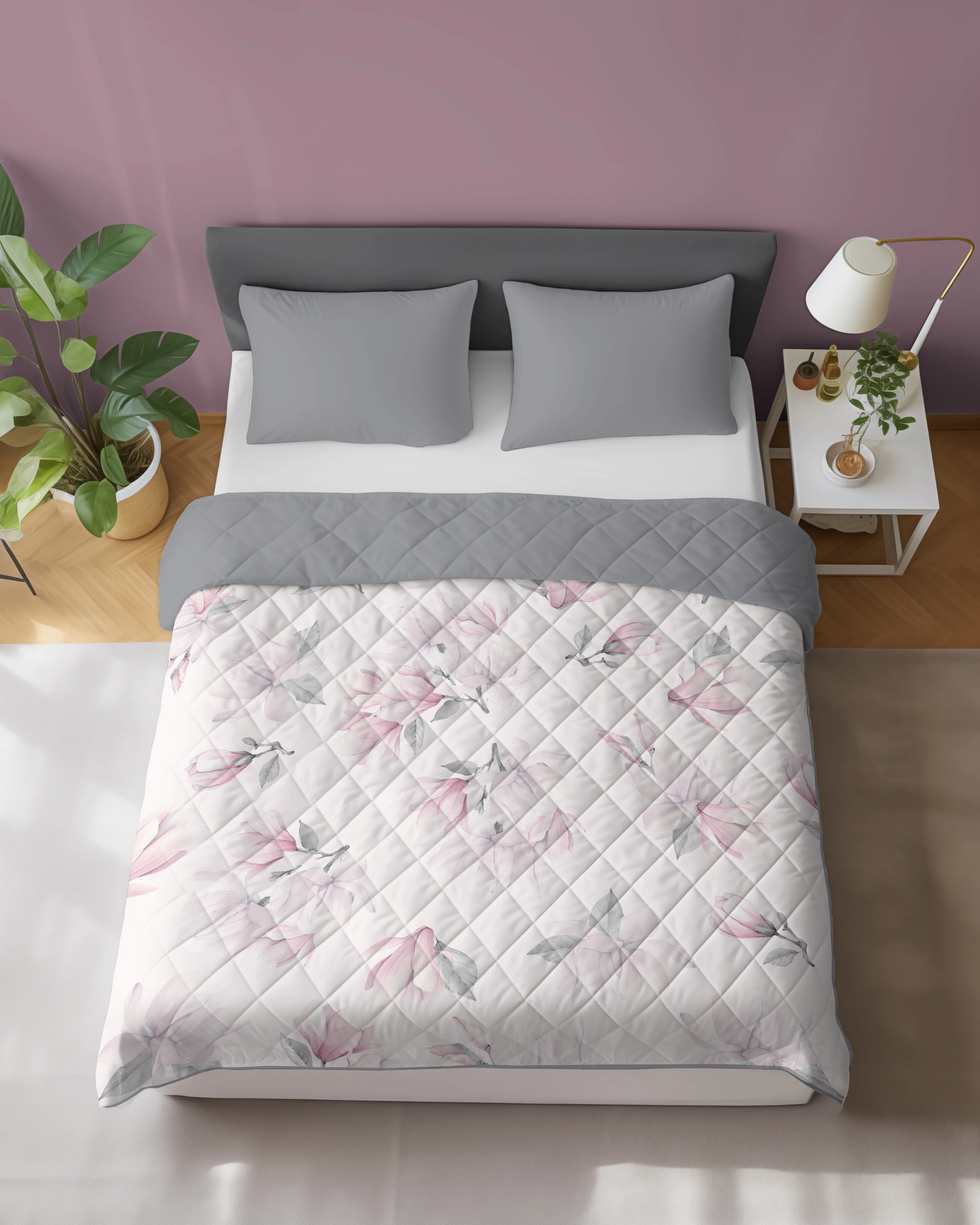 Narzuta Pikowana Dwustronna 200x220 cm. Pudrowy Różowy Szary Kwiaty NR-K118