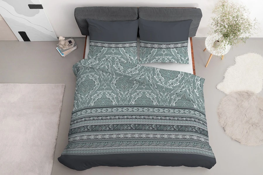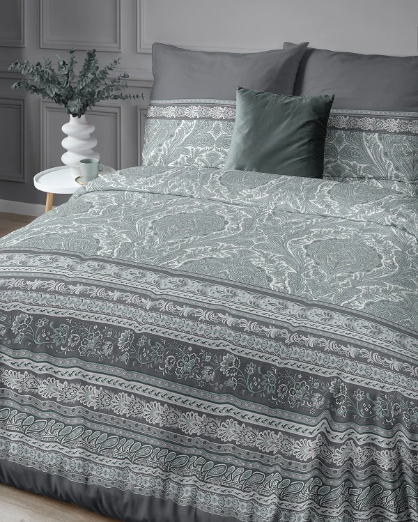 Ekskluzywna Pościel Z Bawełny Satynowej 220 x 200 cm. Grafitowa Miętowa Kwiaty Pasy 4606-A