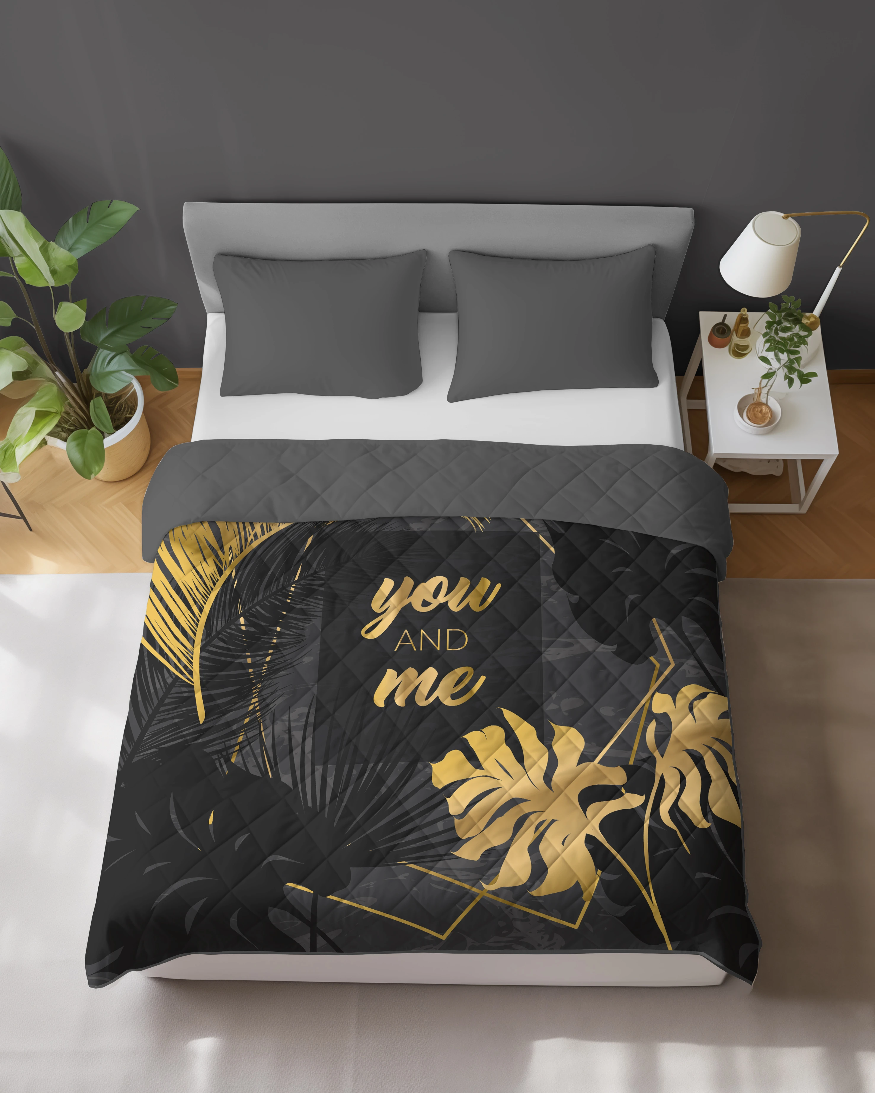 Narzuta Pikowana Dwustronna 200x220 cm. Czarna Złota Szara Liście NR-K103