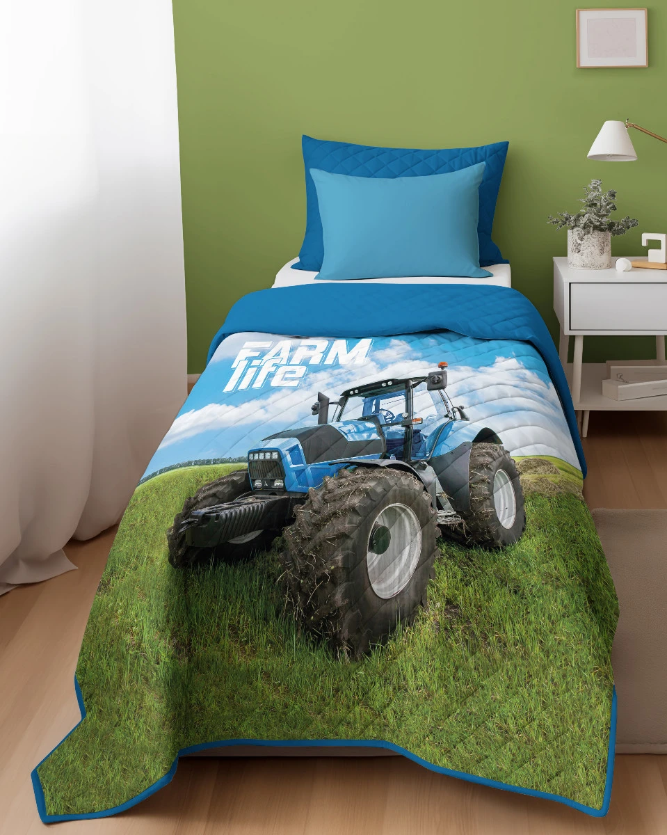 Narzuta Młodzieżowa 170x210 cm. Pikowana Zielony Niebieski Łąka Traktor K-79