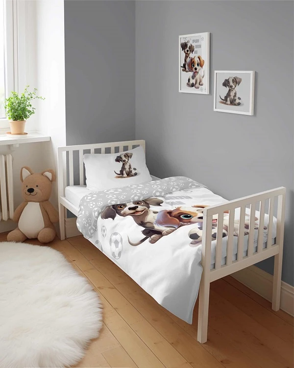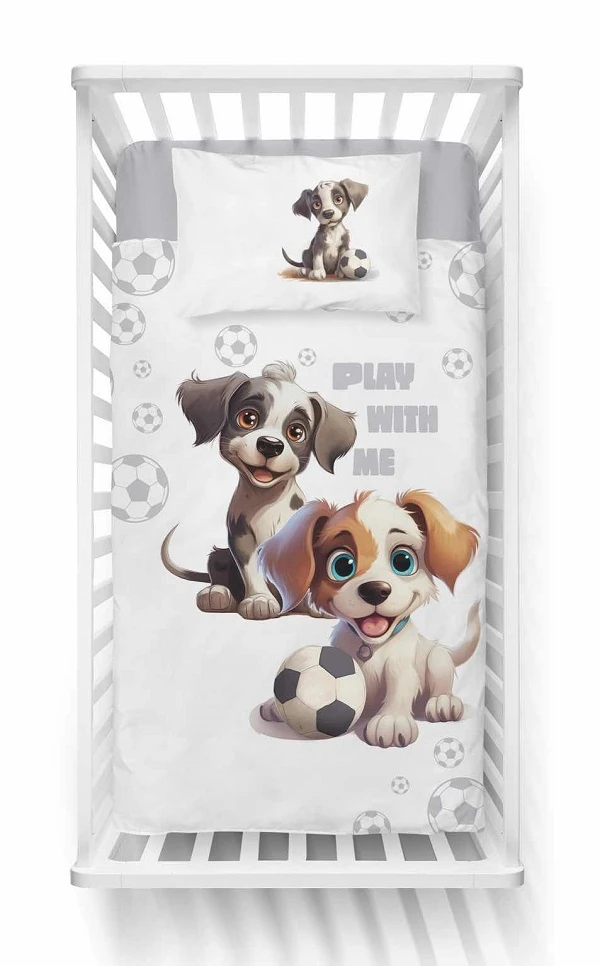 Pościel Dziecięca Bawełniana Do Łóżeczka 90x120 cm. Biała Szara Pieski Piłka Nożna 5002-B