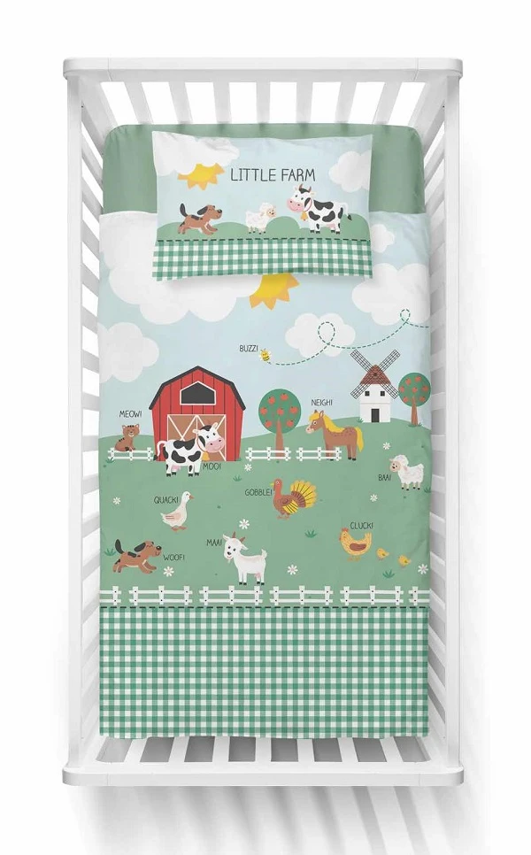 Pościel Dziecięca Bawełniana Do Łóżeczka 90x135 cm. Zielona Niebieska Farma Kratka 4991-A