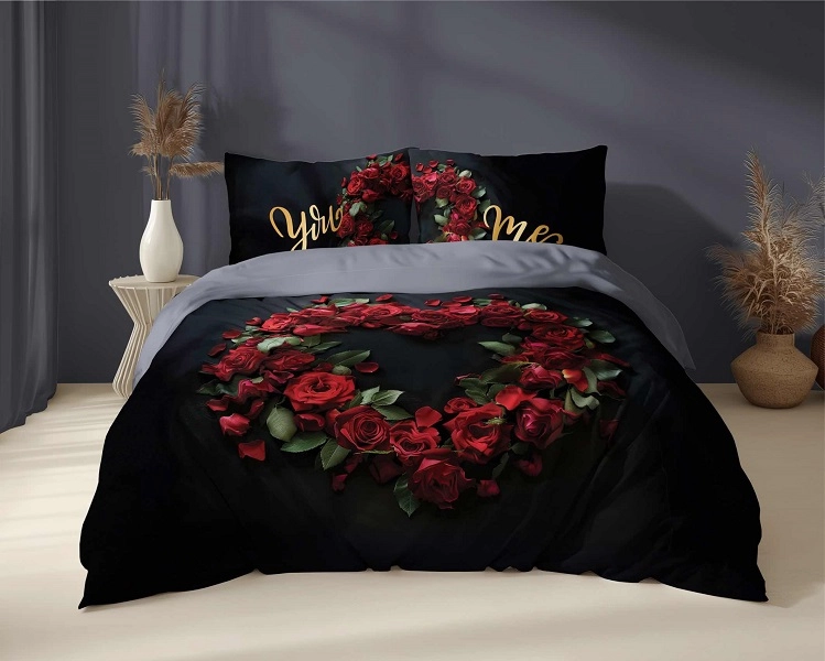 Pościel Holenderska 160x200 cm. 100 % Bawełna Czarna Serce Czerwone Róże 5287-A