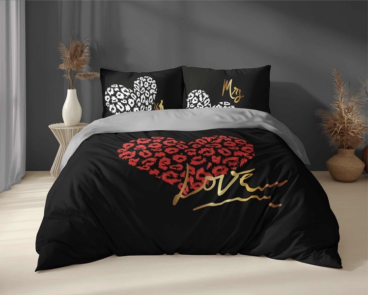 Pościel Holenderska 160x200 cm. 100 % Bawełna Czarna Serce Czerwone Białe Love 5291-A
